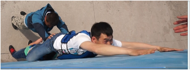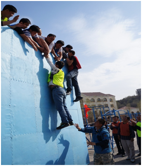 當(dāng)只剩下最后兩個(gè)人的時(shí)候,項(xiàng)目的難度再一次加大,一個(gè)人用雙手雙肩支撐最后一個(gè)人,使其能夠和墻體頂部的人匯合,而最后一個(gè)人則是要靠攀爬的方式攀附到倒數(shù)第二個(gè)人的身上,最后一刻,大家的心都懸起來了,撕裂的聲音一遍遍的傳來,“小心”“加油”“小心”“成功啦”“成功啦”