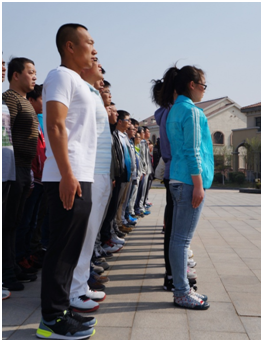拓展前奏項(xiàng)目是15分鐘站軍姿,“腳跟靠攏并齊,兩腳尖向外分開約60度;兩腳挺直;小腹微收,自然挺胸;上體正直,微向前傾;兩肩要平,稍向后張;兩臂自然下垂,手指并攏自然微屈,拇指尖貼于食指的第二節(jié),中指貼于褲縫;頭要正,頸要直,口要閉,下頜微收,兩眼向前平視”,這一系列的動(dòng)作要領(lǐng)看似簡(jiǎn)單,但要都做到位也不是件容易的事。應(yīng)教官要求,所有人不得佩戴墨鏡,站在四級(jí)風(fēng)里,不管是風(fēng)吹亂了頭發(fā)還是面部奇癢,都必須保持一動(dòng)不動(dòng),隊(duì)列中任何一人出現(xiàn)絲毫失誤,全員受罰。當(dāng)有人出現(xiàn)失誤,教官宣布軍姿站立時(shí)間延長(zhǎng)時(shí),無人回頭觀望尋找“罪魁禍?zhǔn)?rdquo;,更無人發(fā)出聲響表示因被牽連而不滿,于是軍姿站立得越來越好,越來越標(biāo)準(zhǔn)。教官給大家講了軍人巴特擦皮鞋的故事,巴特自認(rèn)為已經(jīng)光亮如鏡的皮鞋一次次被軍官訓(xùn)責(zé)有塵土,重新擦拭,巴特沒有爭(zhēng)辯、沒有反抗,有的只是一次次的回應(yīng)“是的,長(zhǎng)官”“好的,長(zhǎng)官”“沒問題,長(zhǎng)官”……因?yàn)樵谲娙说母拍罾?,沒有個(gè)人主義,只有絕對(duì)的服從,這不僅僅是單純的命令服從,更是一種精神靈魂的凝聚。這讓我想起海軍出身的金港建設(shè)及其團(tuán)隊(duì)“令行禁止、指哪打哪兒”的行為作風(fēng),曾經(jīng)是公司立身寶馬廠區(qū)的行為準(zhǔn)則,可隨著時(shí)間的推移和工作內(nèi)容、共事人員的熟悉,這種“令行禁止”執(zhí)行得漸漸模糊了,作為管理人員的我們著實(shí)需要每隔一定時(shí)間就將沉淀在大家內(nèi)心深處的集體意識(shí)喚醒,點(diǎn)燃。
