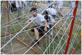 3、勇闖盤絲洞:該項目體現(xiàn)的是考慮問題要敢于打破固有思維模式,勇于挑戰(zhàn)新的方式方法,同樣,缺少團隊精神也必將不能收獲成功的喜悅。這個挑戰(zhàn)項目看似簡單,需要隊員單獨或以合作方式快速穿越彈力繩障礙網(wǎng),進行團隊競賽比拼,所以在排兵布陣及前瞻性的統(tǒng)籌安排就大有學問了。在挑戰(zhàn)中,我們可以清晰的意識到,作為團隊中的每一個個體,都深刻的影響著整個團隊的步伐。只有每個人都盡力了,整個團隊的力量才能夠被激發(fā),才能實現(xiàn)更高的目標。