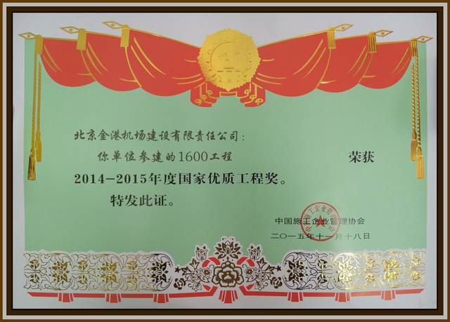 2014-2015年度國家優(yōu)質(zhì)工程獎獲獎證書