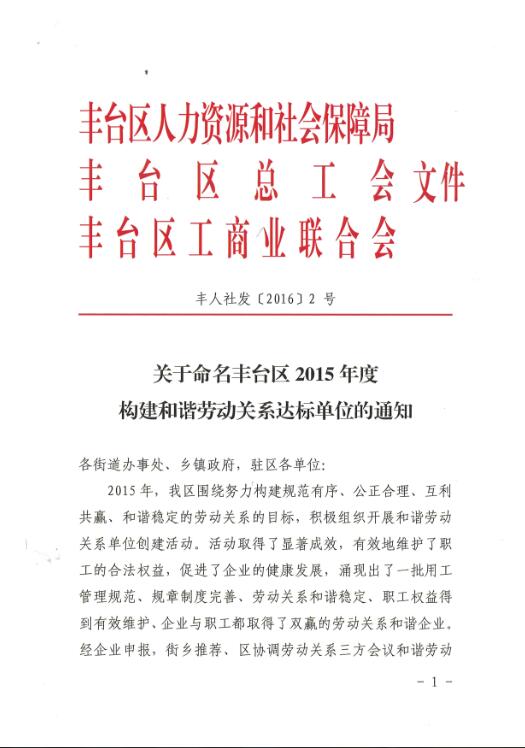 在豐臺區(qū)人力資源和社會保障局、豐臺區(qū)總工會、豐臺區(qū)工商業(yè)聯(lián)合會組織開展的創(chuàng)建和諧勞動關(guān)系單位活動中,由公司人力資源部申報、街道審核推薦、區(qū)協(xié)調(diào)勞動關(guān)系三方會議審查研究,我單位在眾多申報的單位中脫穎而出,同其他13家企業(yè)一同被評為“2015年度豐臺區(qū)構(gòu)建和諧勞動關(guān)系達(dá)標(biāo)單位”。