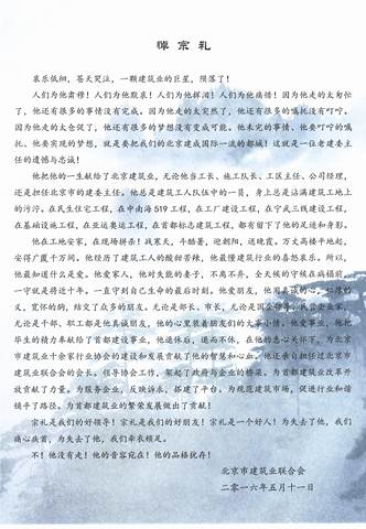 2016年7月18日上午我代表譚子恒董事長參加了北京市建筑業(yè)聯(lián)合會組織召開的王宗禮會長追思會。參加人員有原建設(shè)部長汪光燾、建設(shè)部副部長易軍、市建筑業(yè)聯(lián)合會欒德成會長、各協(xié)會、企業(yè)代表共23人。會議由欒會長主持,與會人員分別發(fā)言、緬懷和追憶了王宗禮會長生前獻(xiàn)身首都建筑業(yè)的豐功偉績,他心系企業(yè)、心系員工、心系家人的崇高品德和人格魅力。緬懷和追憶是為了傳承和弘揚(yáng),總結(jié)提煉是為了更好的學(xué)習(xí)和光大。