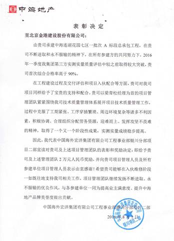 2016年8月1日,由中海地產(chǎn)開發(fā),我司承建的中海連湖花園七區(qū)A標(biāo)段工程,在2016年一季度中海第三方實(shí)測(cè)實(shí)量中取得了較大的突破,首次綜合合格率高于90%,得到了甲方的一致好評(píng)和公開表揚(yáng)。