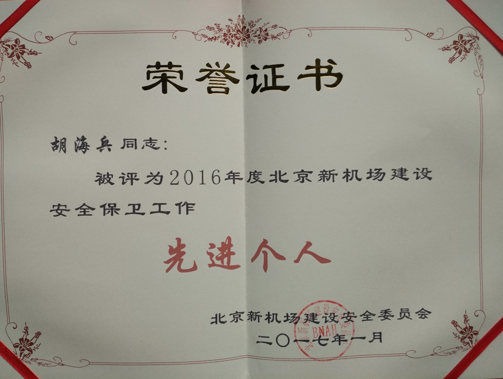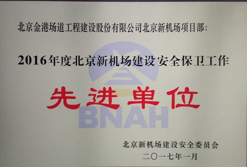 場道股份公司北京新機場項目部在2016年的項目管理中對安全保衛(wèi)工作高度重視,認(rèn)真履職,有效落實安全責(zé)任,圓滿完成了全年保衛(wèi)工作,取得了消防、治安、交通事故“零發(fā)生”的階段勝利。為表揚我公司新機場項目部在安全保衛(wèi)工作中做出的突出成績,北京新機場建設(shè)安全委員會特授予我公司新機場項目部“安全保衛(wèi)工作先進(jìn)單位”榮譽稱號,授予項目部安全員胡海兵被“安全保衛(wèi)工作先進(jìn)個人”榮譽稱號。