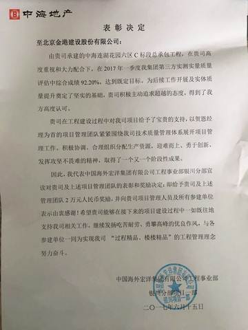 2017年6月15日,由中海地產(chǎn)開發(fā),我司承建的中海連湖花園六區(qū)二期C標(biāo)段工程,在2016年一季度中海第三方實(shí)測(cè)實(shí)量評(píng)估中取得了92.02%的好成績(jī),超出了中海地產(chǎn)預(yù)定的標(biāo)準(zhǔn)線,在中海眾多施工企業(yè)中樹立了先進(jìn)的典型。